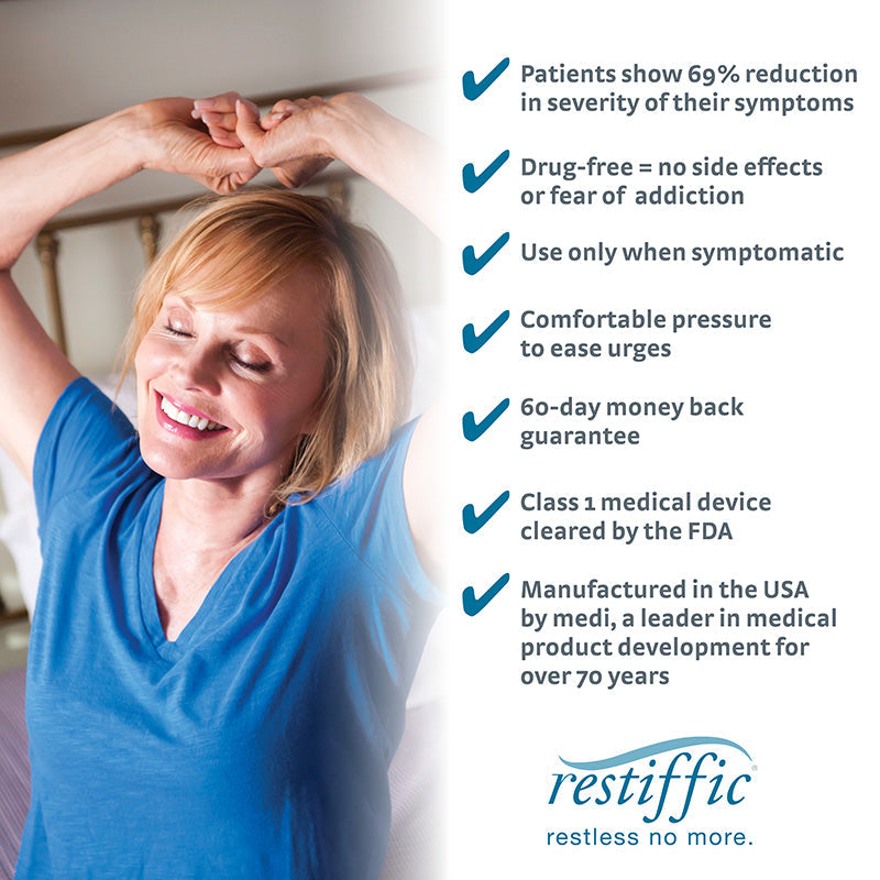As an FDA-cleared prescription device, restiffic RLS is clinically shown to reduce restless leg severity. Enjoy drug-free relief and transform your nights into restful, rejuvenating sleep.